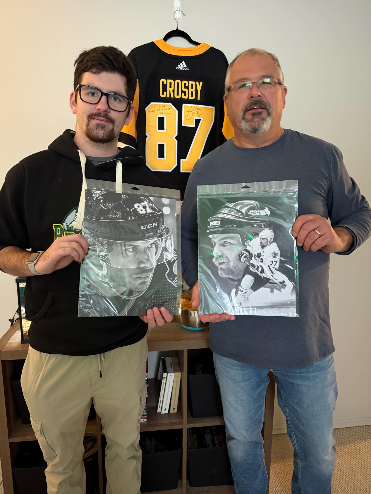 Dan Pietens (Pietens Art) is one of the most talented sports artists in the world. Dan, an Ontario native, is incredibly generous and has provided us with several amazing prints of his mind boggling pencil drawings. On our recent trip to Humboldt we were able to surprise Layne and Kevin Matechuk with a couple of Dan’s incredible pieces! That’s Layne on the left and Kevin on the right. Layne suffered a TBI in the Humboldt bus crash and his all time favorite player is Sidney Crosby and Kevin’s is Wendell Clark! So of course we had a perfect place for these amazing pics!