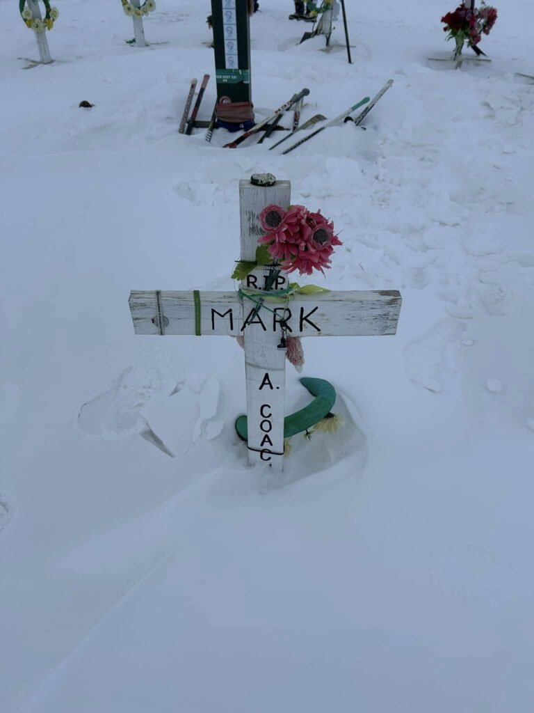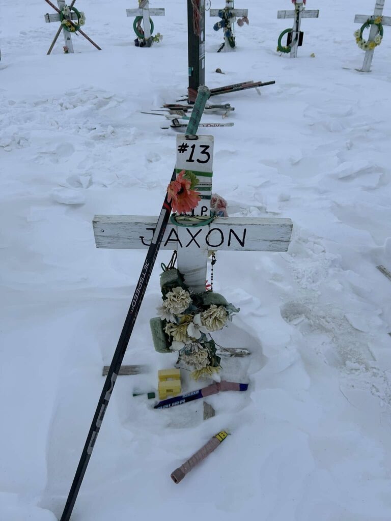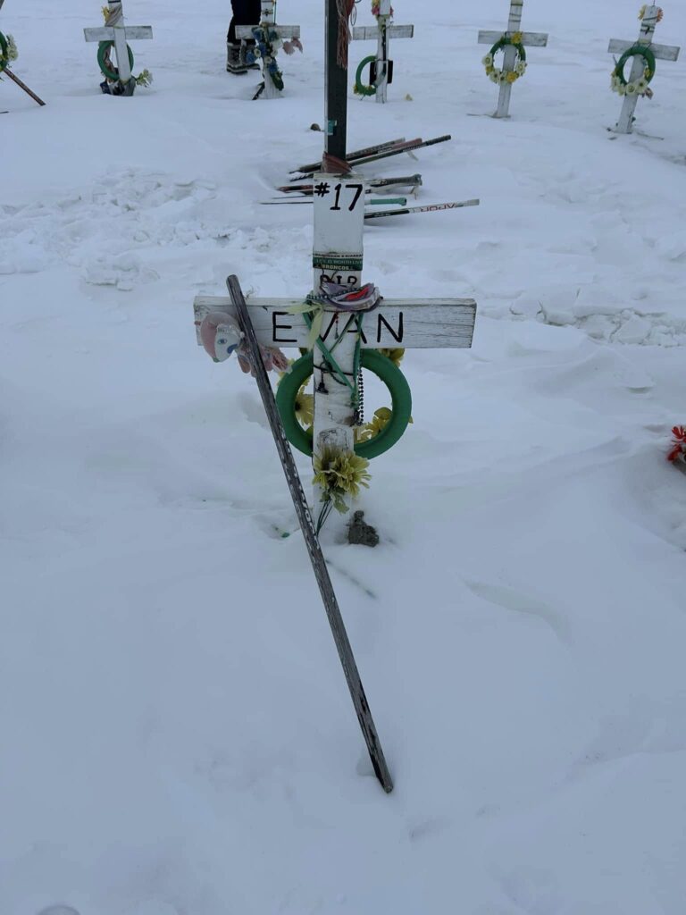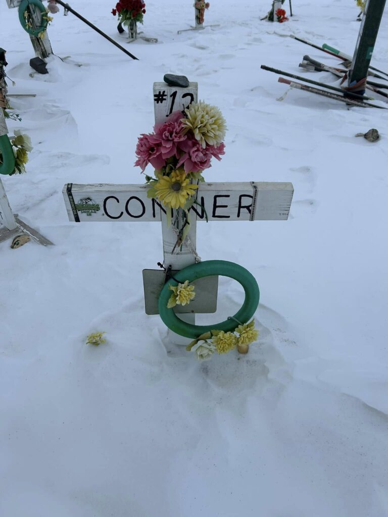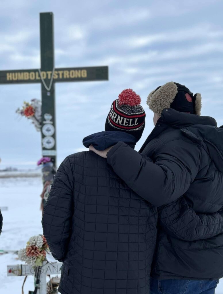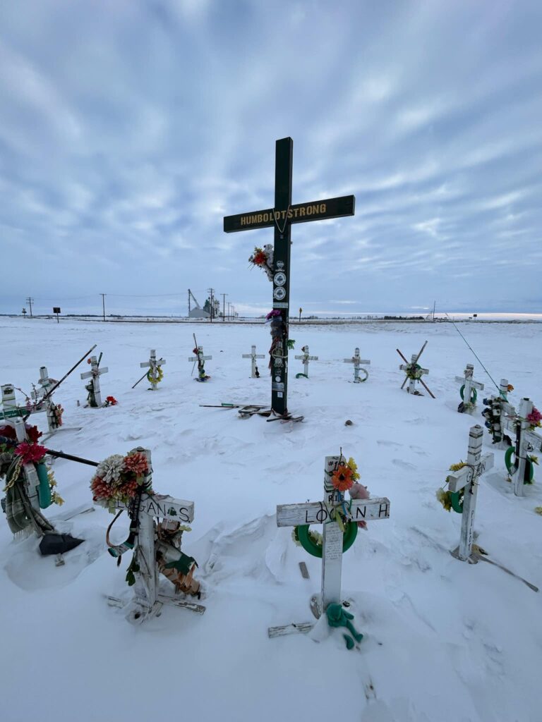 To me, the most important part of every Humboldt trip is to honor and pay our respects to the sixteen lives that left us way too soon. This morning we made the trek to site of the crash that changed the life paths of 29 families and impacted the entire hockey world. One by one, we paused and talked about each of names on the sixteen crosses. That was followed by an emotional prayer lead by Dave Carr as our small group from Colorado stood in a united circle. Tears rolled down our cheeks as we took in the enormity of this sacred site and tried to fathom the pain these families still endue. It is a difficult place to viait, but at the same time I couldn’t feel more blessed to have been welcomed into the lives of so many of these amazing families. God Bless you all.